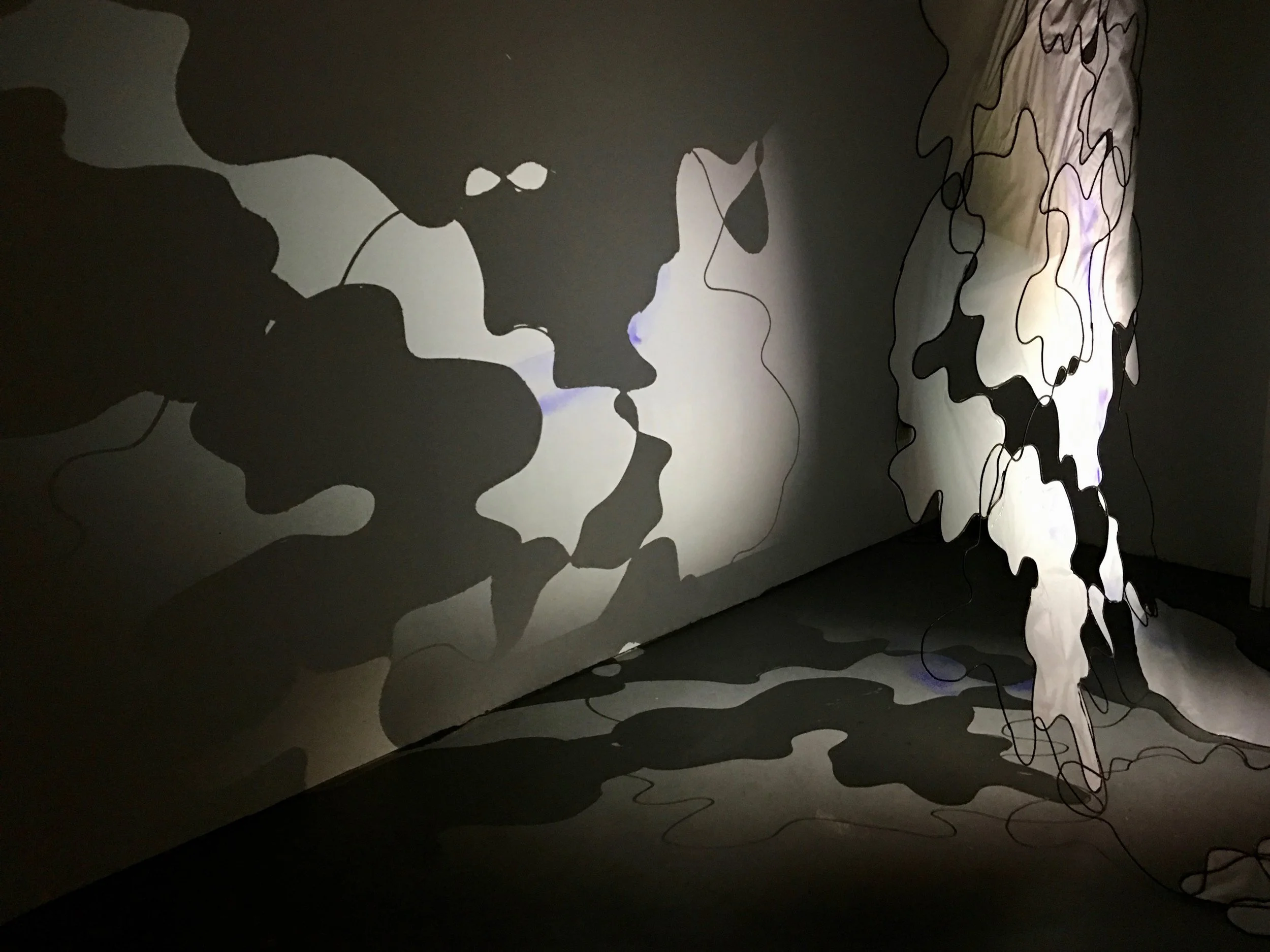 A mix of paper and wire with a series of projections of watercolor animations.